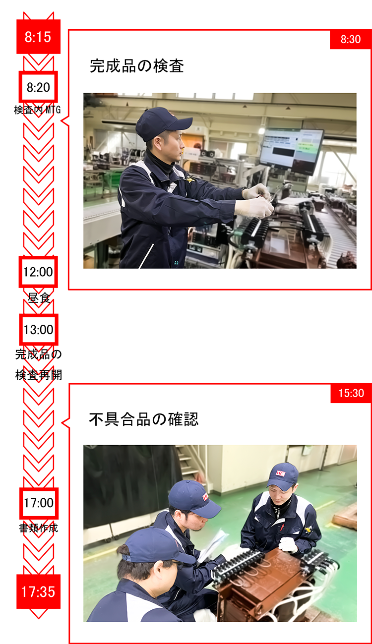 検査チームに所属をして、最終工程として完成された製品検査を担当しています。主にトランスの外観検査、仕様書の確認、通電試験を行っています。具体的には製品の汚れや塗装剝がれ、仕様書の製造記録の確認や通電をして製品に異常がないかを確認しています。最終工程として不良品を流出させないように一つ一つしっかりと確認をしながら作業を行っています。また受注生産品が多く、流れ作業ではないのでやりがいにも繋がっています。
